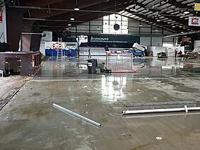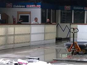 Wie man auf den Bildern unten sieht ist die Fläche noch nicht mal vollständig getrocknet, trotzdem haben es rund 30 unermüdliche Helfer in kürzester Zeit geschafft die Bande, Netze, Zeitnehmer-Box, Spielerbänke, etc. abzubauen und das Icehouse einer großen Lagerhalle ähneln zu lassen. Der besondere Dank gilt dabei neben Fritz Haaf (dem Vorstand des ECE) vor allem der 1. Mannschaft der Eisbären sowie den Rhein-Neckar Gladiators. Denn die Gladiators haben sich dabei hauptsächlich dem Bandenabbau angenommen, damit Sie diese im Gegenzug unentgeltlich übernehmen und auf Ihrem eigenen Hockey-Platz in Ketsch wieder aufbauen können. Da ursprünglich als einzige Alternative die Verwertung der einzelnen Banden-Bestandteile im Raum stand, haben wir mit dieser Option für alle die bessere Lösung gefunden! Denn so wie die SAP-Arena den ECE mit der Bande unterstützt hat, konnte dies nun der ECE für die Gladiators tun.
